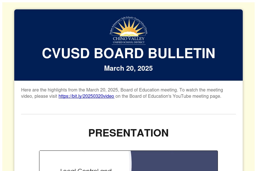 CVUSD BOARD BULLETIN March 20, 2025 Here are the highlights from the March 20, 2025,Boardof Education meeting. To watch the meeting video, please visit https://bit.ly/20250320video. . .